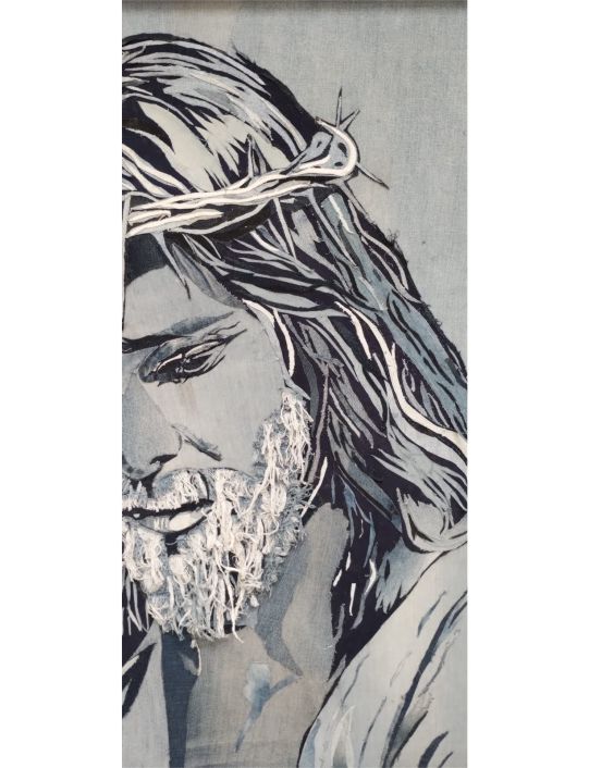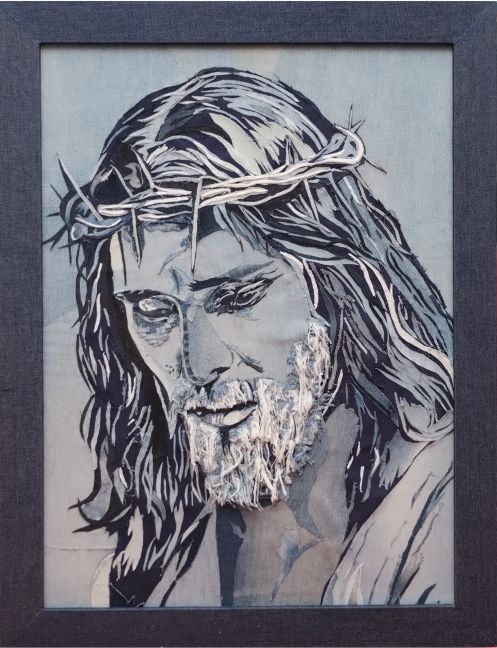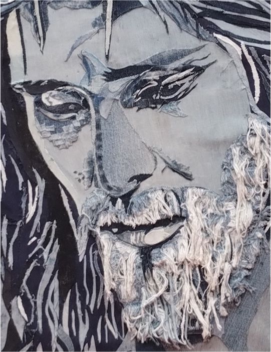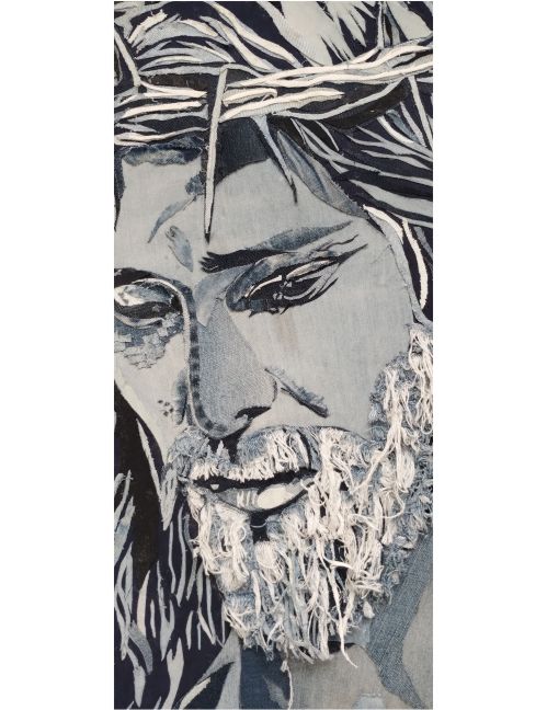 “Descubre la devoción en cada hilo. 🙏✨ Mi última creación es un tributo a la fe y la creatividad, fusionando el arte del collage textil denim con la imagen de Jesús.