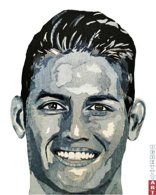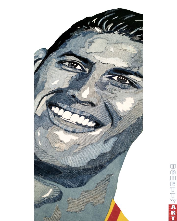 Cada fragmento de denim recuperado cuenta una historia y forma parte de este retrato que refleja no solo el rostro de un ídolo, sino también el espíritu de lucha, dedicación y grandeza que lo caracteriza. La camiseta amarilla con detalles en rojo evoca los colores de nuestra selección, resaltando el orgullo y patriotismo por nuestra tierra.
