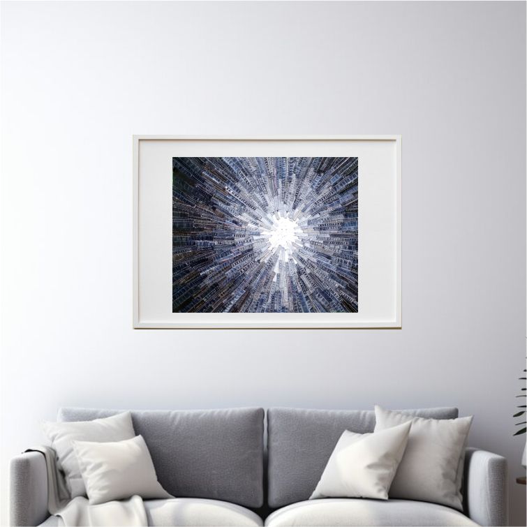 con envío gratuitoObra de arte abstracto realizada con fragmentos de jeans reciclados organizados en un patrón radial que emana desde un punto blanco central. Los trozos de mezclilla, de diferentes tonalidades de azul y gris, están dispuestos de manera que simulan un estallido o explosión que se despliega hacia afuera. Las costuras y detalles de cada pieza de denim añaden textura y profundidad al diseño, creando un lindo efecto.
